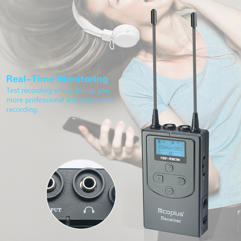 Mcoplus UHF-WMU96 is an wireless microphone with dual-transmitter triggered by one receiver, it utilizes UHF wireless FM technology and high-resolution lattice screen, 16-level adjustable volume, and integrated into LCF(Low Cut Filter Mode), Auto-scanning, Auto IR Channel-match, stereo/mono swithchable audio mode, RF signal strength adjustment, MIC/LINE IN input dual selection, power monitoring at receiver end, sound pickup dynamic display, backlight adjustment and other functions, at the same time with strong shielding anti-noise performance, it's a high-quality microphone to broascasting level.